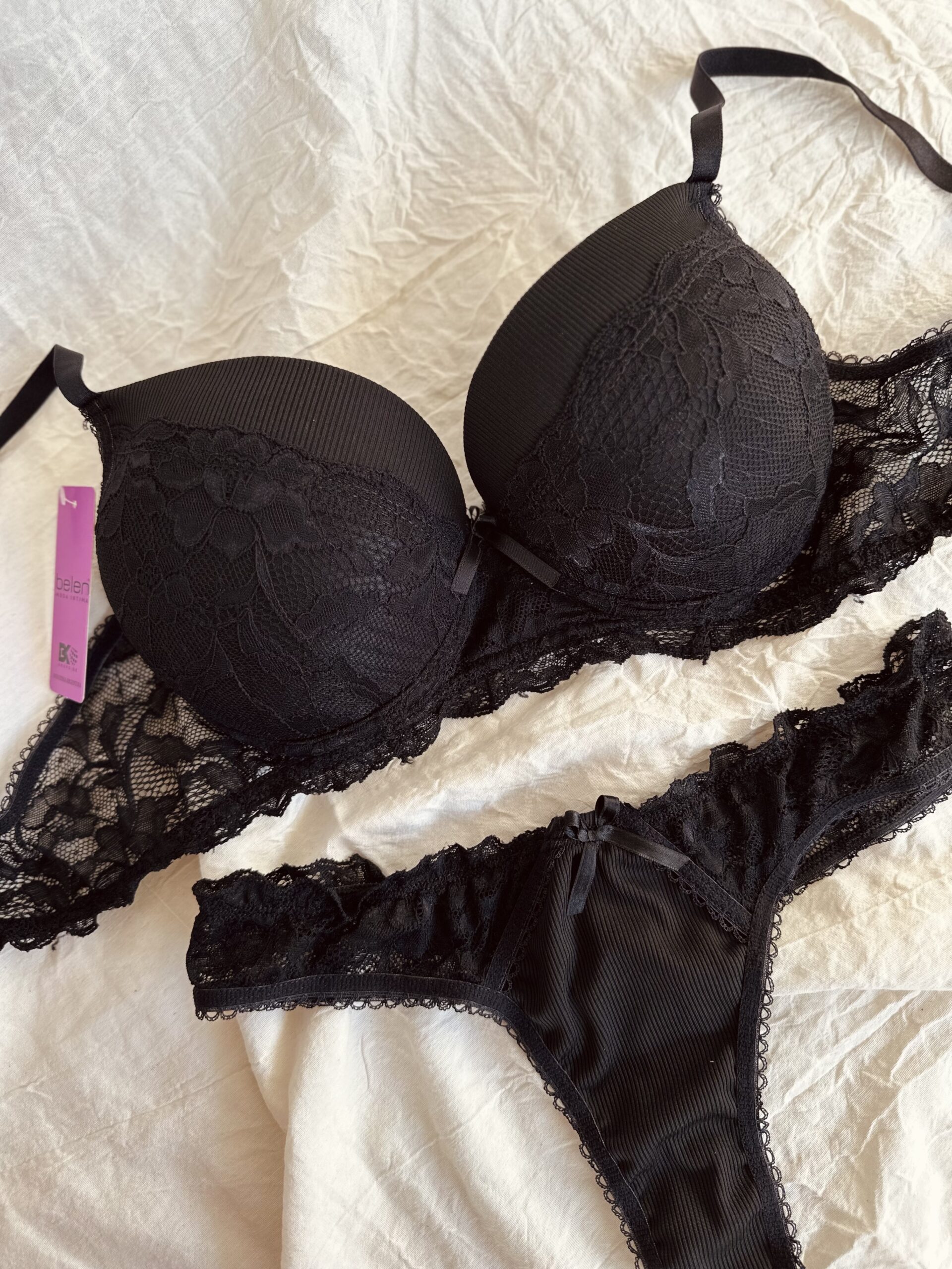 Conjunto de morley y puntilla. Corpiño taza soft con arco y colaless.