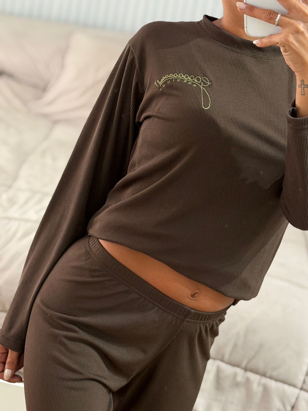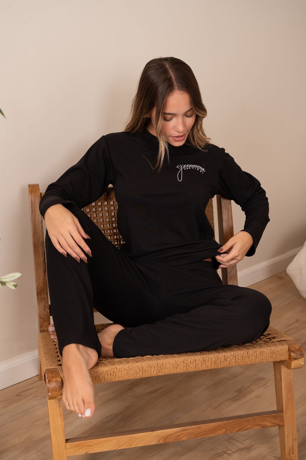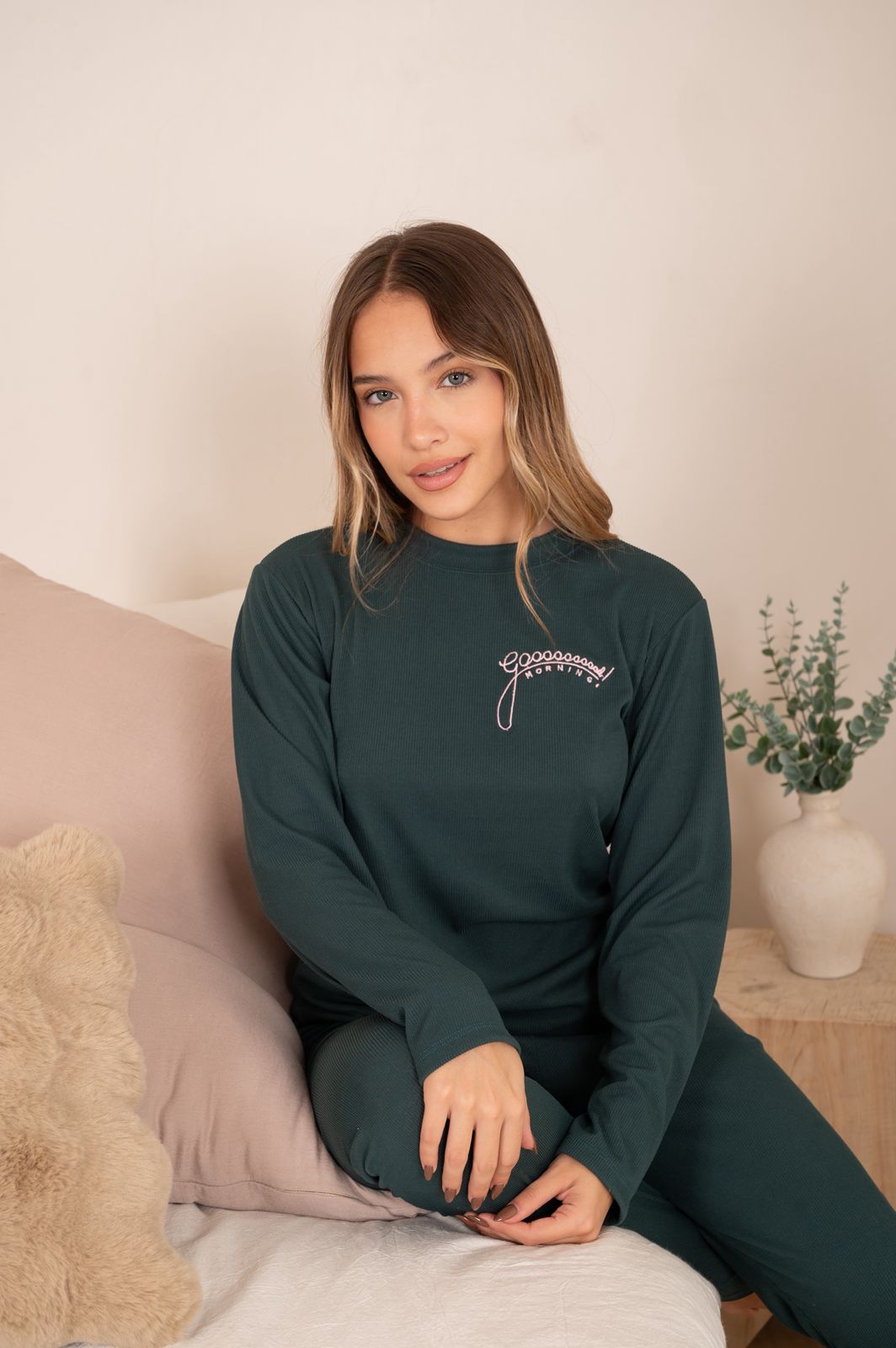 Pijama de morley soft. Remera manga larga y pantalón recto.